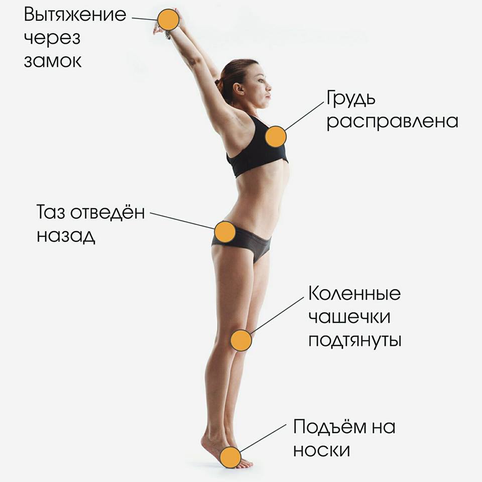 Важно! Вытягивайтесь от низа живота по бёдрам вперёд. Ступни держите вертикально, направляя пальцами вверх и разворачивая внешнюю поверхность стоп наружу. Замком вытягивайтесь назад, раскрывая грудь и вытягивая плечи, затем вверх и к затылку.