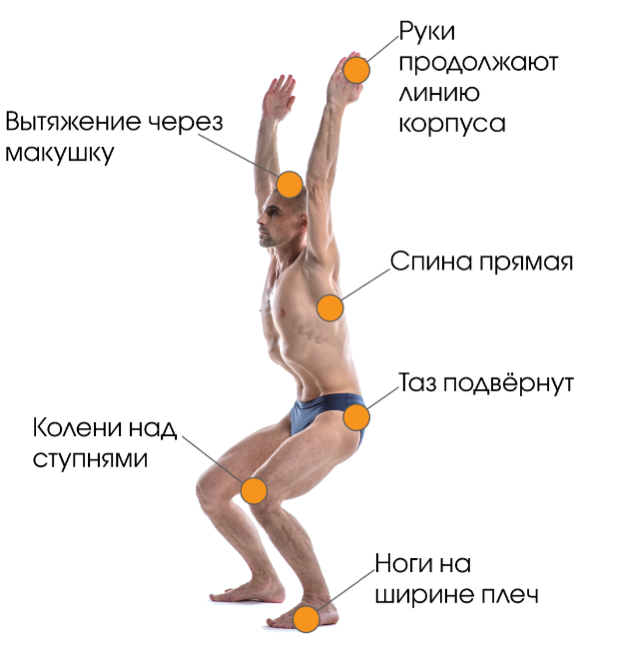 Важно! Подверните копчик так, чтобы область поясницы была ровной, без прогиба. Вся линия тела вытянута по вертикальной оси. На начальных этапах практики не усердствуйте с глубиной приседания. В дальнейшем, когда в достаточной мере окрепнут мышцы, уткатасану можно выполнять в усложненном варианте: бедра параллельны полу, колени не выходят за носки, корпус допустимо наклонить вперед, сохраняя ровное положение спины – без поясничного прогиба. Линия рук продолжает боковые линии тела.