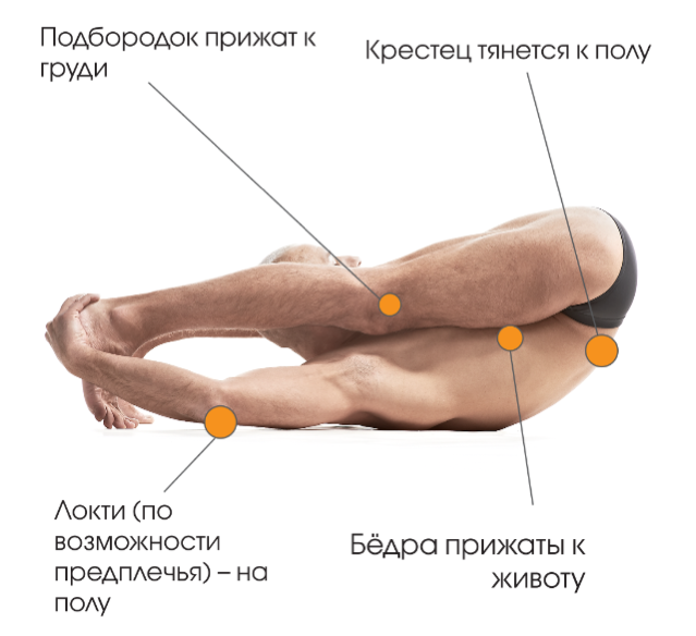Важно! Ноги прямые. Не опускайте голову на пол. Вытягивайте ноги между тазом и пятками, носками ног тянитесь к полу за головой, а тазом и поясницей в противоположную сторону.