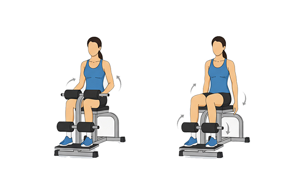 Тренировка проходит в равномерном ритме — по 2 секунды на движение вверх и вниз. В такой динамике нужно сделать 4 подхода по 15–20 повторений. Во время тренировки в сидячем положении спина должна быть прижата к спинке, а колени должны находиться ровно и не выворачиваться наружу.