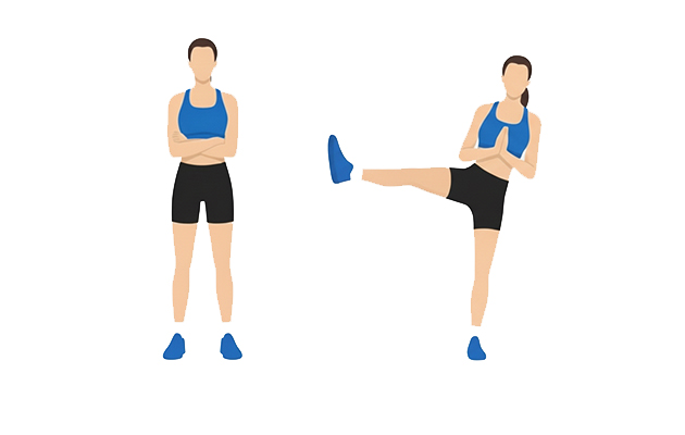 В данном упражнении необходим ускоренный темп, при этом ногу нужно стараться поднимать как можно выше. Количество повторов подбирается индивидуально, рекомендуется выполнять не менее 20 повторений (по 10 на каждую ногу).