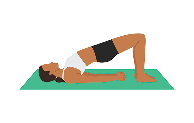 - Нужно поднять таз на выдохе так, чтобы плечи, ягодицы и колени образовали прямую линию, при этом ягодицы требуется сжать.