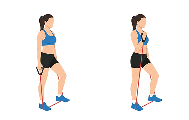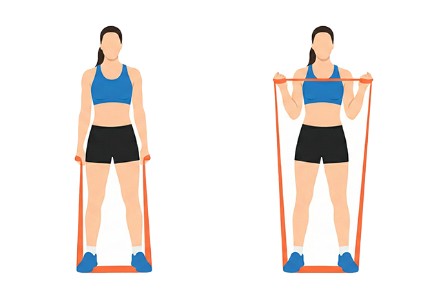 - На выдохе плавно сгибайте руки в локтях, преодолевая сопротивление резинки, пока не достигните уровня плеч.