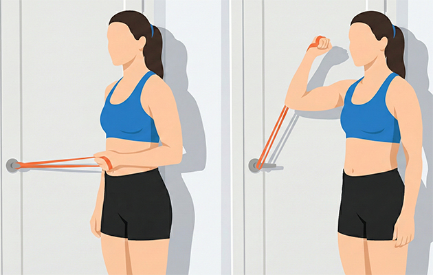 - Согните рабочую руку в локтевом суставе, поднимите руку с резинкой до уровня плеча.