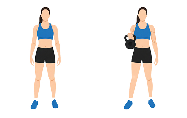 - На вдохе согните руку в локте и поднимайте гирю до уровня плеч.