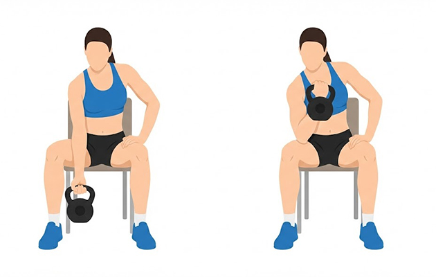 Упражнение не требует много времени, выполнять его можно даже сидя на рабочем месте. Важно следить за спиной и плечами — не перенаправлять усилия, а работать только бицепсами.