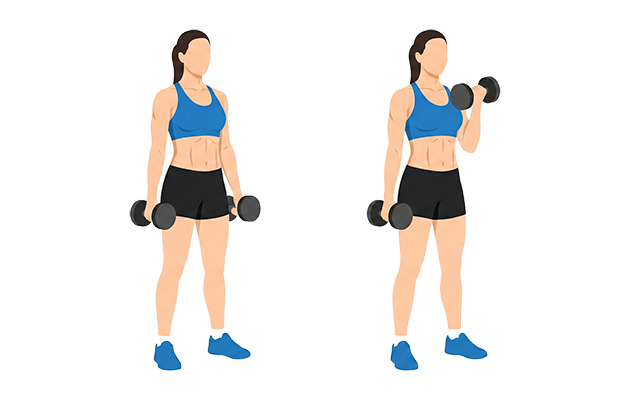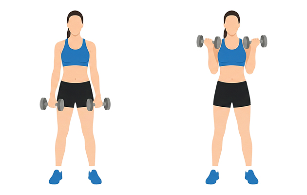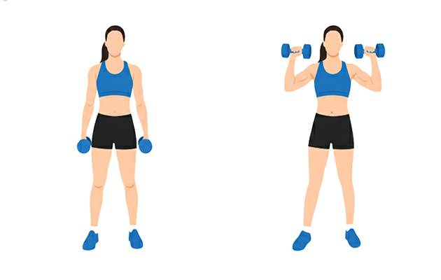 - На выдохе согните руки и приподнимите гантели к плечам.