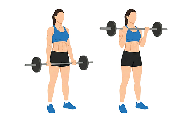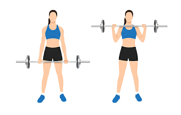 - Начинайте медленно поднимать штангу. Запястья не сгибайте. Необходимо дойти до уровня плеч, после чего также медленно опустить гриф.