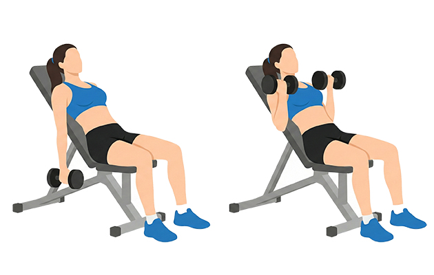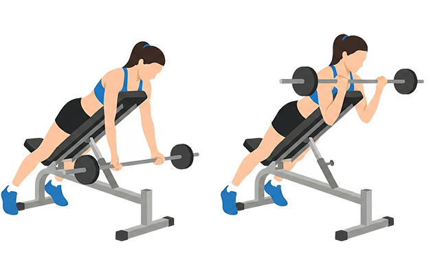 Подъем штанги на бицепс сидя на наклонной скамье (45–60°)