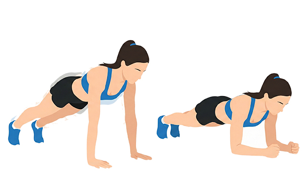- Опуститься на предплечья. Переместить вес с ладоней на локти.