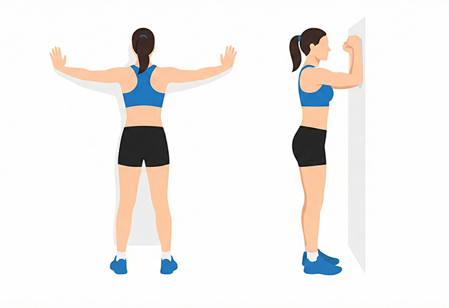 Повторы — рекомендуется выполнять от 3 до 5 подходов с отдыхом между ними примерно в течение 30 секунд. Выполняя упражнение, дыхание не нужно задерживать, оно должно быть ровным. Если присутствует боль в запястьях, можно согнуть руку. Правильное выполнение выглядит так: ладони не скользят по стене, а бицепсы твердые.