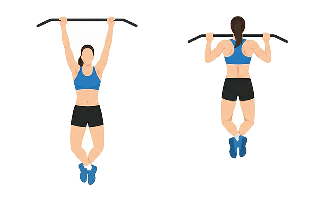 Корпус должен быть напряжен, движения выполняются без раскачки, плавно. Если с первого раза не получилось подтянуться — используйте стул. Зафиксируйте тело в максимально высокой точке и уже с этой позиции медленно опускайтесь вниз.