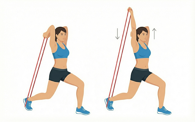 Чтобы приступить к выполнению упражнения зафиксируйте резинку одной стопой. При этом ногу необходимо отставить назад. Другой конец резинки возьмите противоположной рукой — руку поднимите согнутой в локтях на 900 над головой и держите спортивный инвентарь сзади. Плечо должно быть параллельно полу. Теперь можно приступать к тренировке: на выдохе разгибайте руку, выпрямляя локоть, на вдохе — возвращайтесь в исходное положение. Проделайте то же самое с другой рукой, предварительно поменяв ногу.