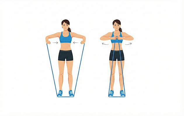 - На выдохе — сведите руки перед собой до максимального натяжения жгута.