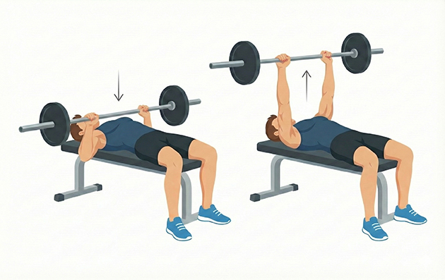 - Медленно опустите снаряд вниз до уровня нижнего края грудных мышц.