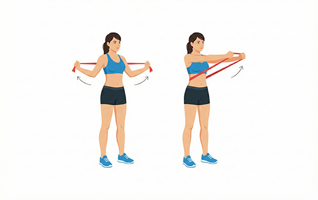 Во избежание смещения нагрузки, руки во время тренировки не должны опускаться ниже груди. Крайне важно правильно выбрать силу натяжения — если фитнес-резинка слишком тугая, можно компенсировать это за счет изменения хвата ближе к центру.