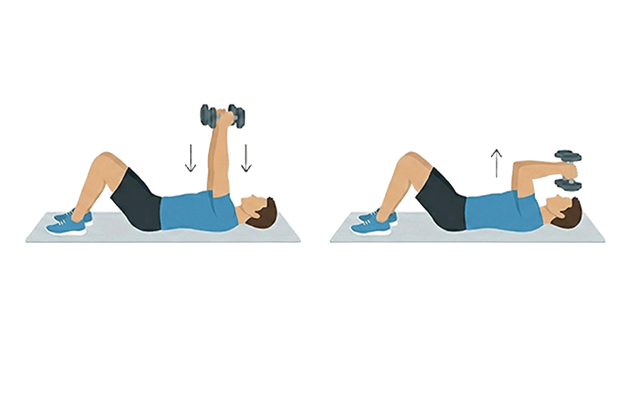 - Лягте на гимнастический коврик и поднимите гантели перед собой.
