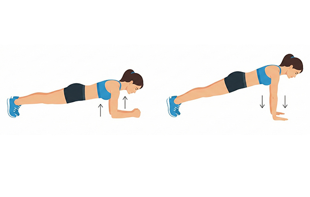 Исходное положение — классическая планка, на локтях. На выдохе нужно выпрямить руки, разогнув локти. На вдохе необходимо вернуться в исходное положение (планка на локтях).