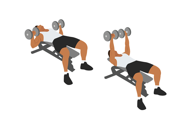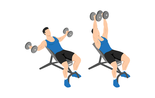Для реализации сядьте на наклонную скамью, прижмите лопатки к спинке, стопы — плотно к полу. Затем поднимите гантели к уровню плеч, ладони должны смотреть вперед. На выдохе — жим вверх без сведения гантелей до соприкосновения. На вдохе — плавно опустите их вниз, слегка растягивая грудные мышцы. Локти уходят чуть в стороны и вниз. Темп — умеренный, без рывков.