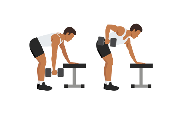 Для выполнения упражнения с гантелями дома встаньте сбоку от от стула, поставьте одно колено на поверхность, опирайтесь на руку той же стороны, а другой рукой возьмите гантель. На вдохе подтяните гантель к боку, двигая локоть строго вдоль корпуса и не заваливая плечо вверх. На выдохе — плавно опустите руку вниз. Держите спину прямой, не прогибайтесь в пояснице. Если же вы хотите применить упражнение в спортзале, воспользуйтесь скамьей.