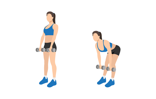 Упражнение начинается из положения стоя, с гантелями в опущенных руках перед бедрами, ладони обращены к телу. Слегка согнув колени, нужно отвести таз назад, удерживая спину прямой и корпус напряженным. Гантели двигаются вдоль ног, примерно до середины голени или чуть ниже — в зависимости от растяжки. Важно избегать округления спины и резких движений: подъем выполняется за счет усилия ягодиц и задней поверхности бедра.