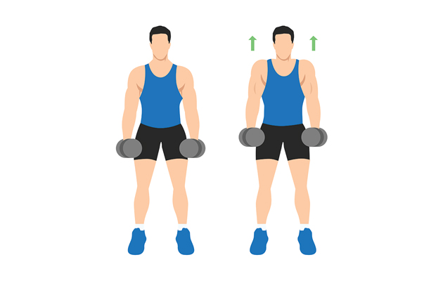 Для выполнения станьте прямо, ноги на ширине плеч, руки с гантелями опущены по бокам. Медленно поднимайте плечи вверх, как будто пытаетесь коснуться ими ушей, без круговых движений и рывков. Задержитесь на пике на 1–2 секунды и плавно опустите плечи вниз. Спина должна оставаться прямой, корпус — неподвижным, не помогайте себе раскачкой.