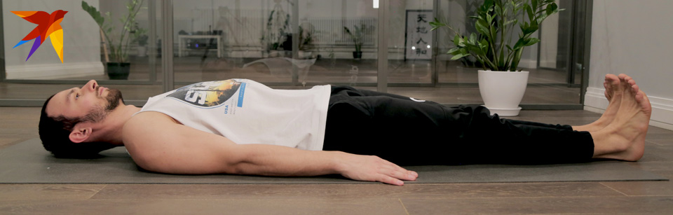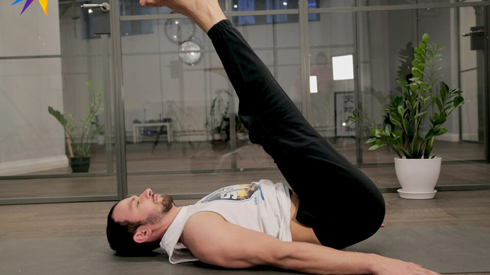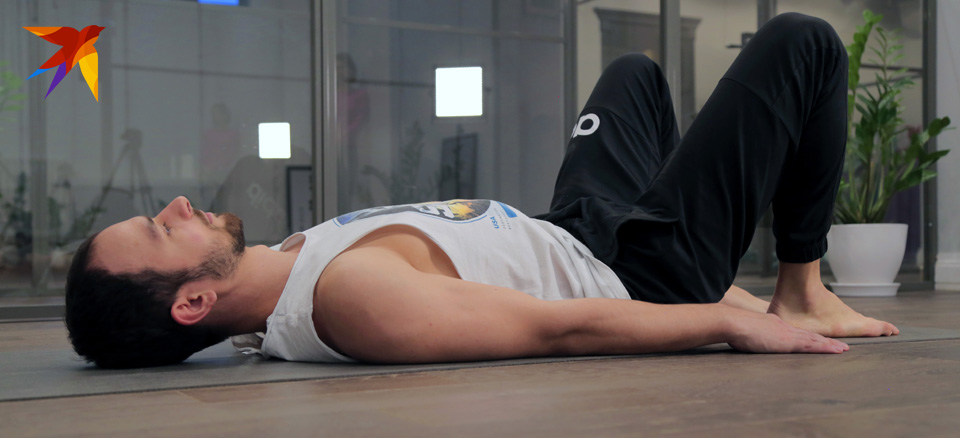 Кто готов идти дальше, глубже — попробуйте в этом положении поднять прямые ноги вверх на 45 градусов. Вместе с ногами вверх поднимается и грудной отдел. Мы вытягиваем руки вдоль линии ног. И удерживаем это положение на протяжении нескольких дыхательных циклов. Дыхание не задерживаем!