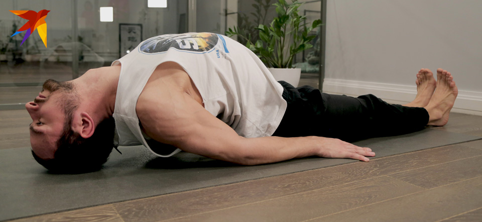 Ложимся на коврик, ноги прямые. Поднимаемся на локтях, упираемся ими в пол и поднимаем центр груди вверх, направляя макушку к полу.