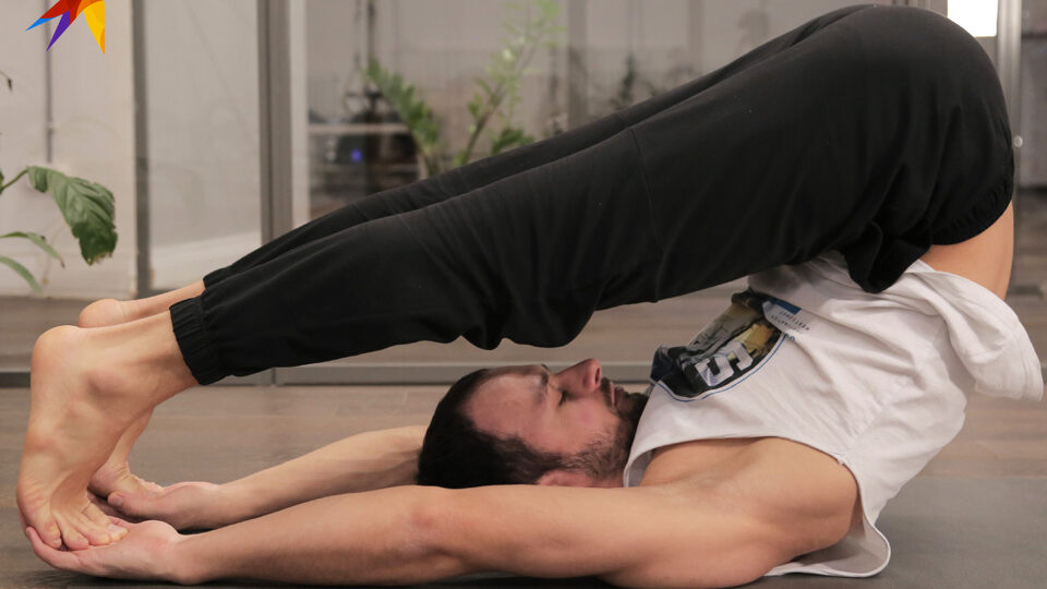 Ложимся на спину. Переводим руки за голову, заводим ноги за голову и опускаем стопы в ладони (Халасана — поза Плуга).