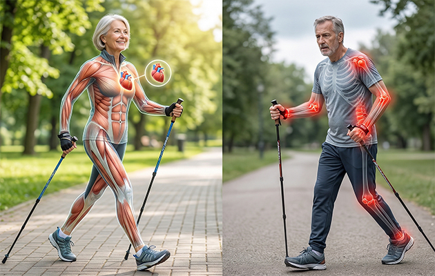 По эффективности скандинавская ходьба ничем не уступает бегу, при этом менее травматична и имеет очень мало противопоказаний. Она абсолютно безопасна для опорно-двигательного аппарата — при ходьбе с палками центр тяжести смещается вперед, тем самым снимая нагрузку с пояснично-крестцового отдела, колен, лодыжек и стоп. При этом сухожилия и связки активно работают, становятся более эластичными и подвижными, снижая риск переломов, что особенно актуально в пожилом возрасте.