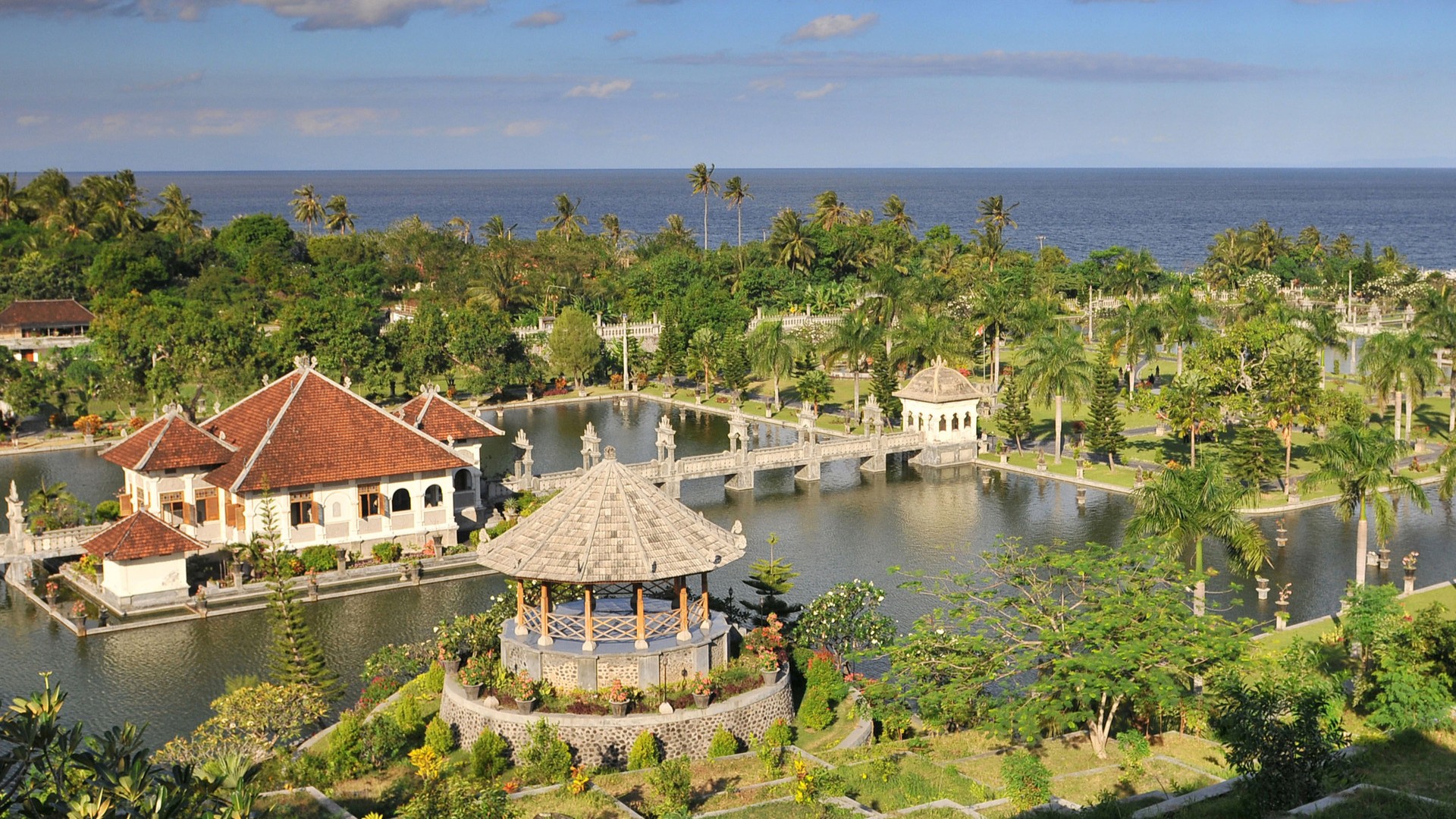 Посетители могут пройти по каменным плитам, расположенным прямо над водой. Дворец окружен рисовыми полями и холмами и считается одним из самых живописных мест на востоке Бали.