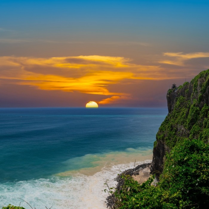 Пляж с белым песком и бирюзовой водой, расположенный на юге Бали, на полуострове Букит. Подходит для романтических прогулок и наблюдения за закатами: живописные скалы, обрамляющие береговую линию, создают ракурсы для фотосессий. В часы заката песок и вода отливают золотистыми и розовыми оттенками.