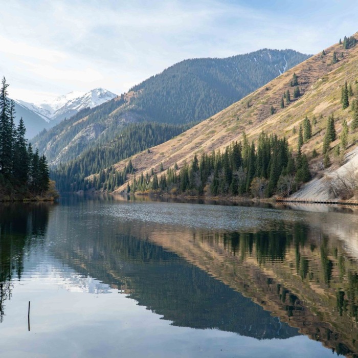 Примерно в часе езды от Алматы находится Большое Алматинское озеро. Водоем расположен на высоте более 2500 метров над уровнем моря. Бирюзовая вода и хвойные склоны формируют почти альпийский пейзаж, а цвет озера меняется в зависимости от сезона и погоды — от светло-голубого до насыщенно-изумрудного. Погода переменчивая и ощущается иначе, чем в городе, стоит взять теплую одежду.