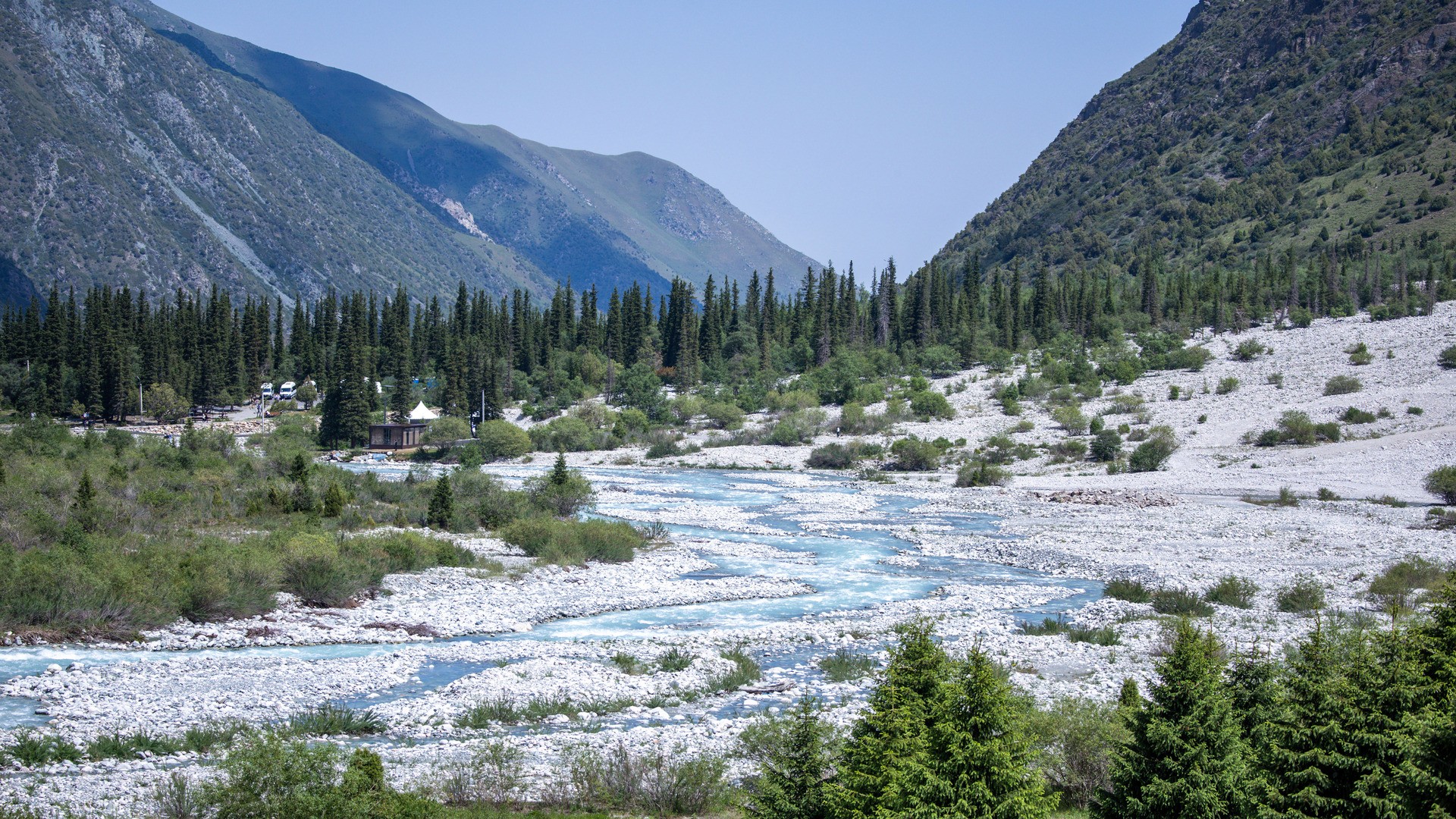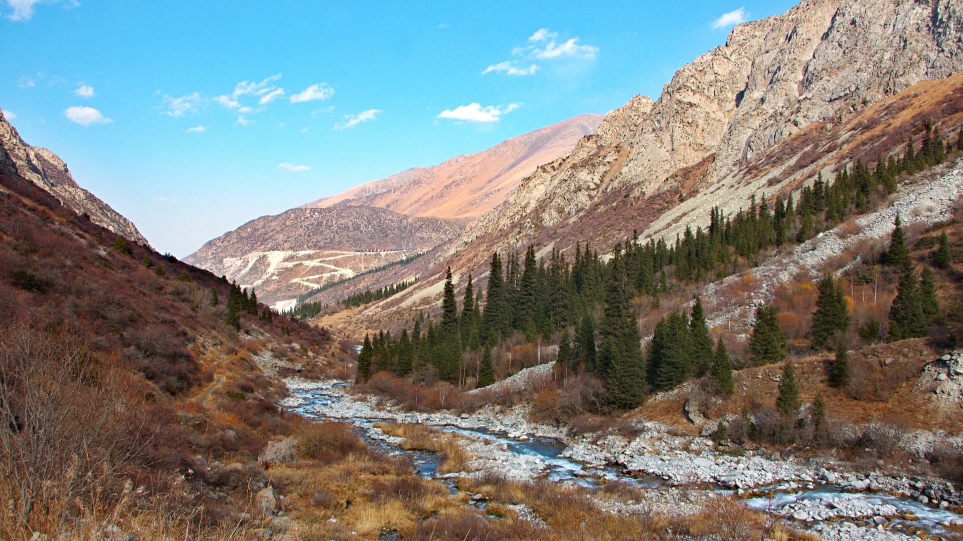 Ущелье Аламедин: горная долина недалеко от Бишкека с рекой, хвойными склонами и маршрутами к горячим источникам и водопадам.