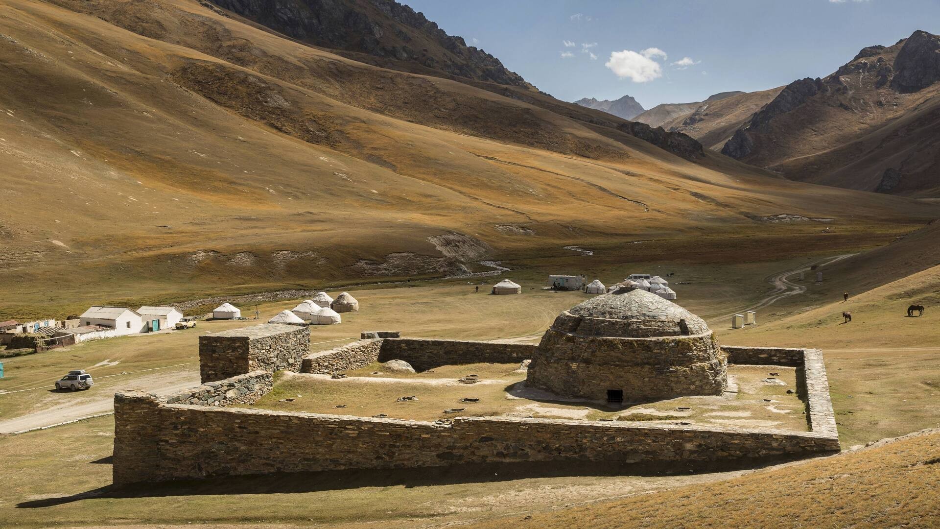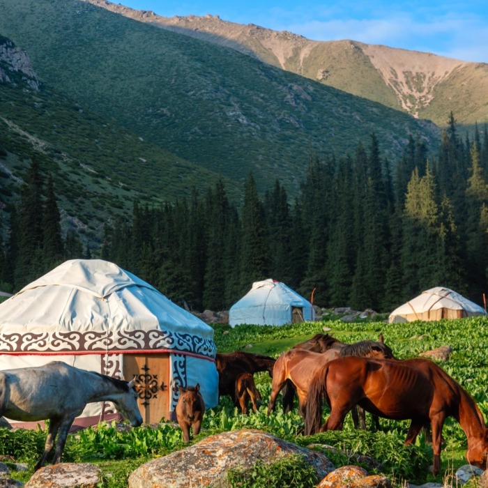 Долина Алтын-Арашан с кыргызскими юртами и лошадьми, город Каракол. Фото: Nick N A / Shutterstock / Fotodom