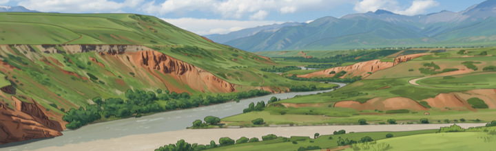 Долина Суусамыр: широкая высокогорная котловина с летними пастбищами. Здесь пролегает одна из главных дорог страны.
