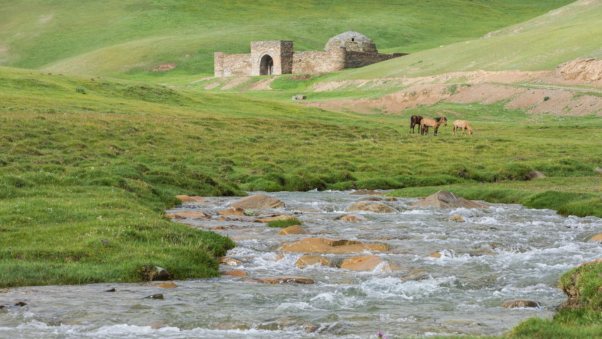 Лошади на зеленом альпийском лугу в ущелье Алтын-Арашан. Фото: Nick N A / Shutterstock / Fotodom