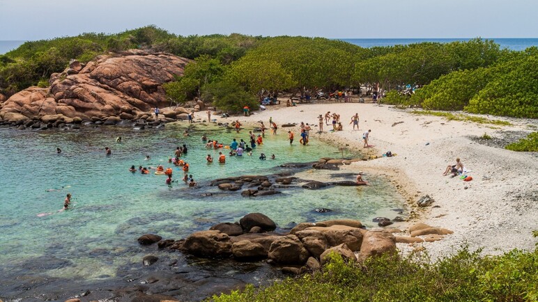 Нилавели — это ощущение «края земли». Туристов здесь мало, природа сохранила свою первозданность. Бескрайний белоснежный пляж с мелким мягким песком и прозрачной бирюзовой водой даже в высокий сезон. Пологий вход в океан без камней делает купание комфортным. Главное приключение здесь — поездка на заповедный Голубиный остров (Пиджеон), среди кораллов и стай разноцветных рыб — идеально для снорклинга и дайвинга. Иногда с конца июля по начало августа у побережья можно наблюдать миграцию китов и дельфинов. Инфраструктура скромная, но включает варианты жилья на любой бюджет, кафе и небольшие лавочки.