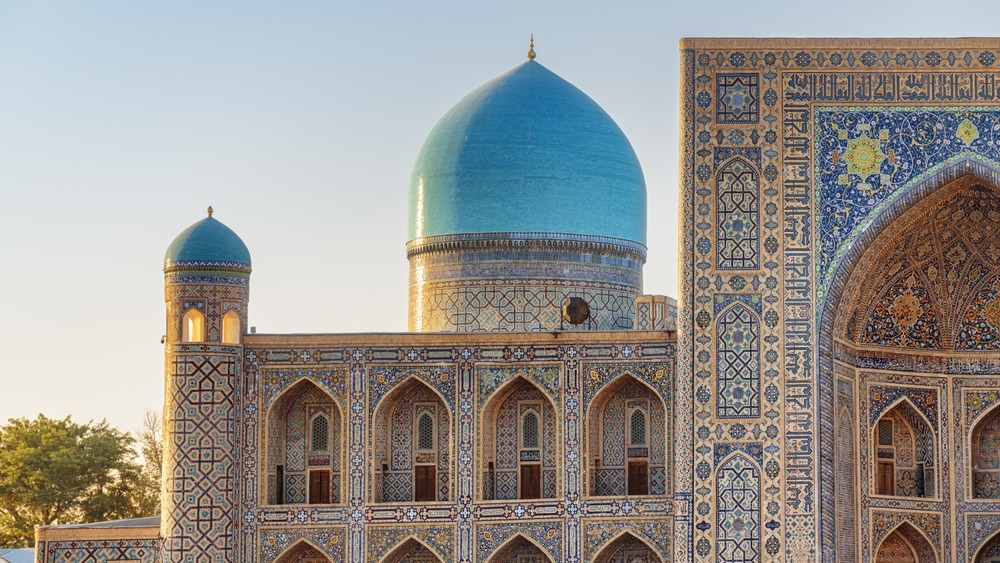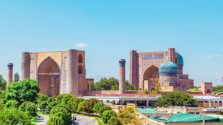 На главной площади Самарканда пересекались караванные пути, здесь же располагался городской центр науки и культуры. Ее самые знаменитые сооружения — три медресе, выделяющиеся филигранной резьбой и узорами.